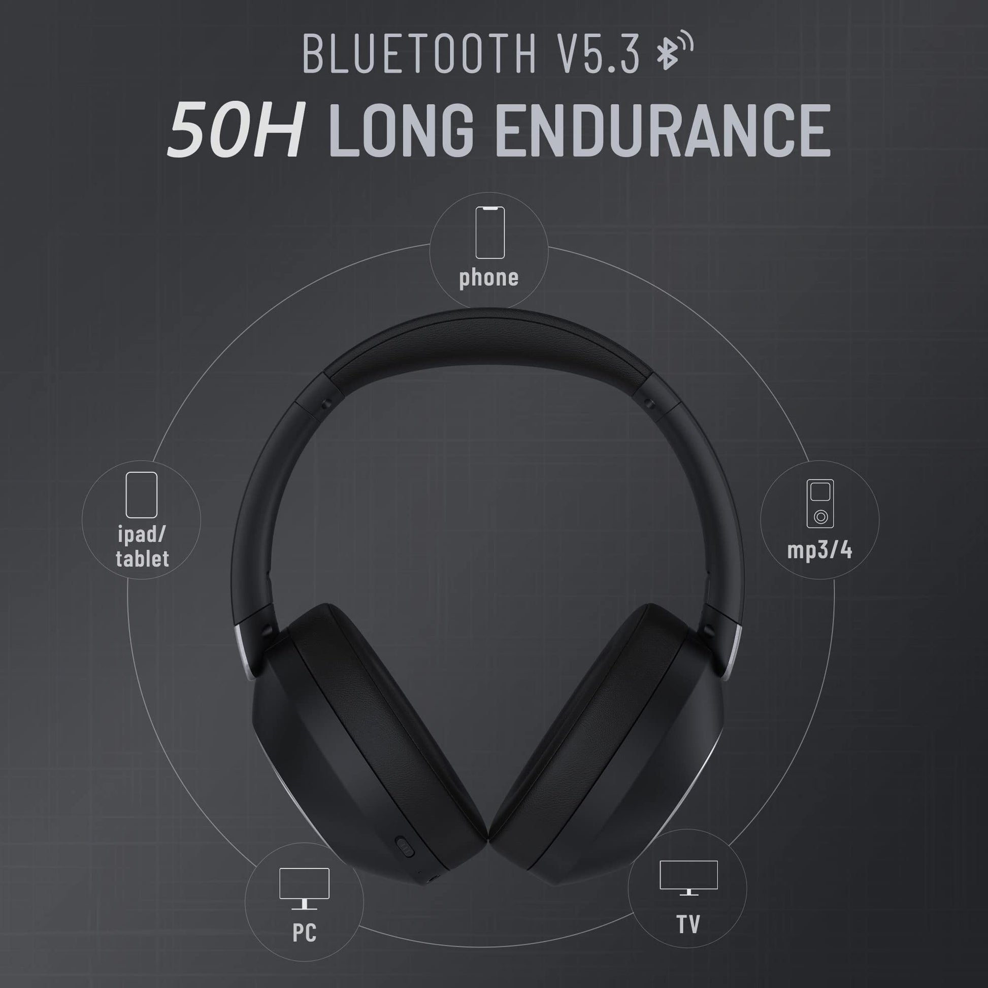 - [ 50 Hours Music Enjoyment ] :A built-in 500mAh battery won't allow your headphones power off. Just a single charge,you can enjoy your world reduce noise for 50 hours' long time . Or plug in 3.5mm stereo audio cable to prolong using time when battery is low .